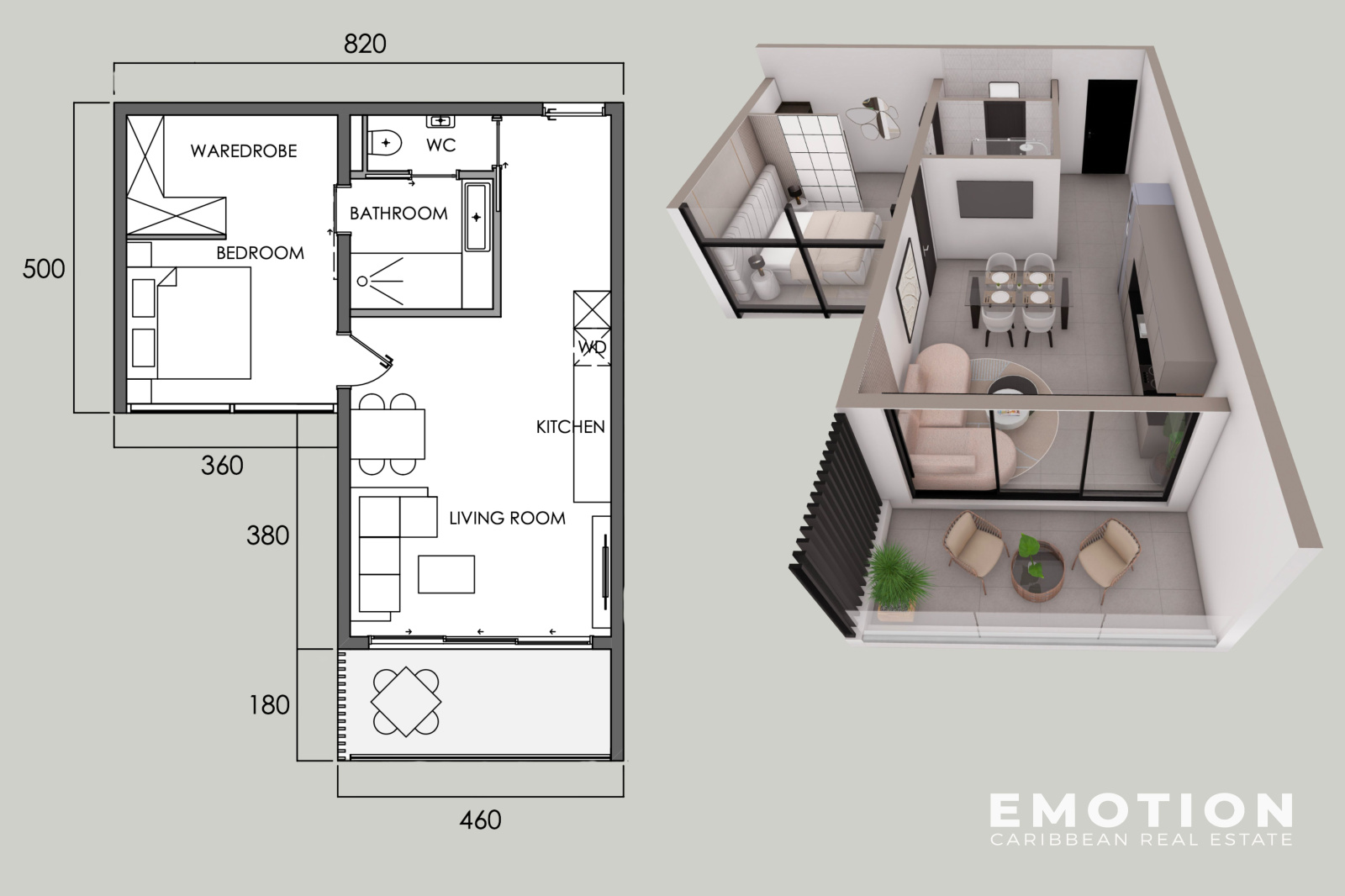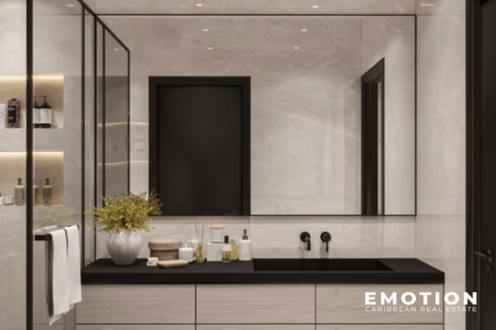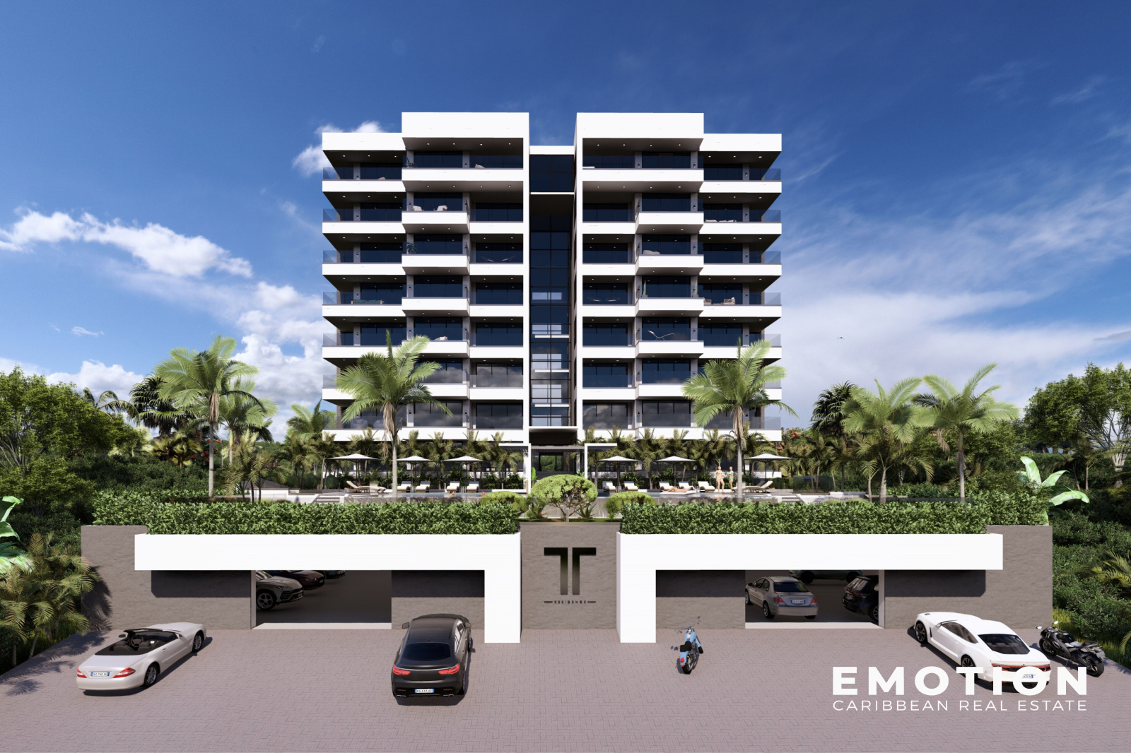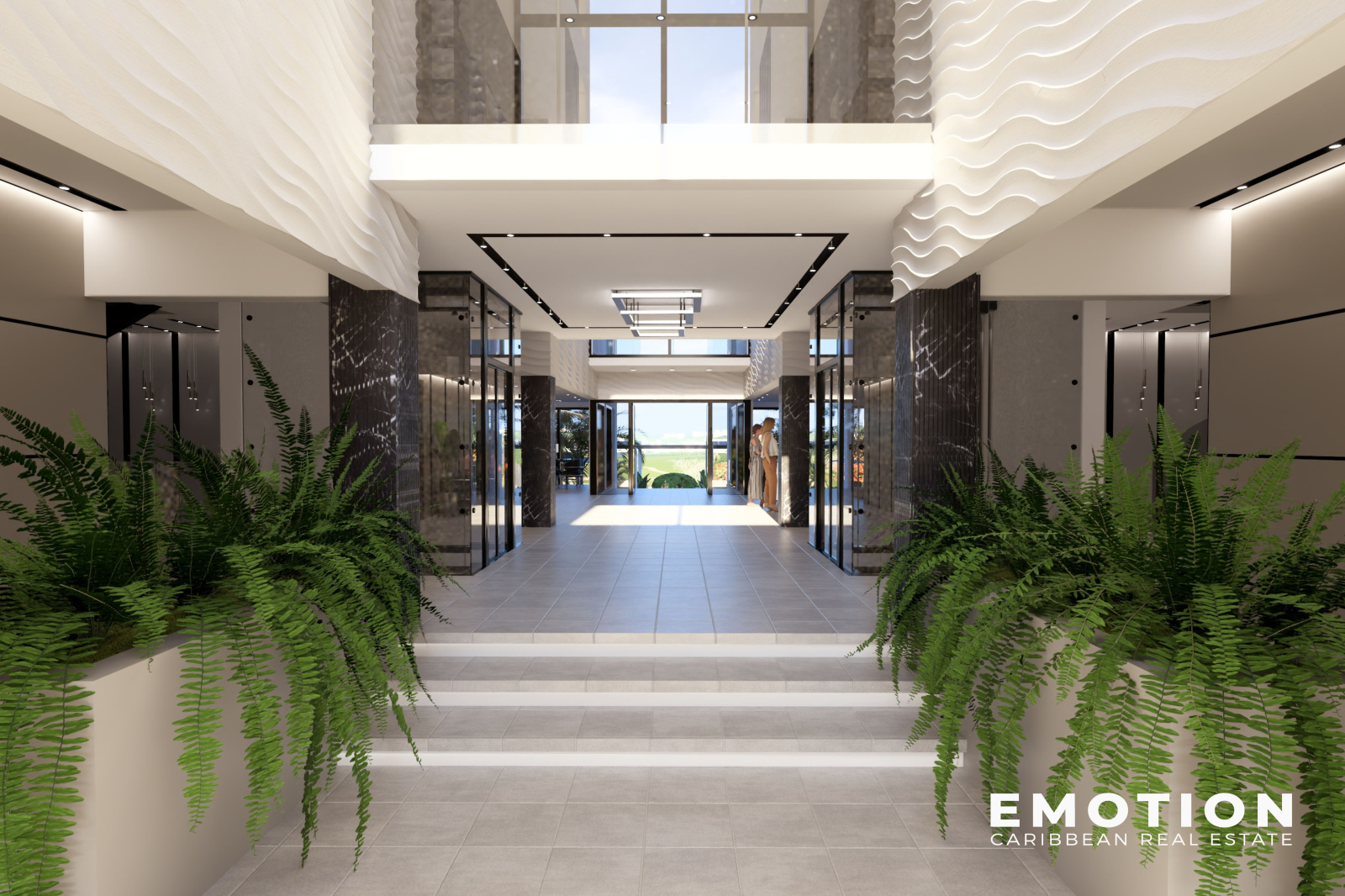 Le bien se compose en annexes : une piscine à débordement entourée de jardins tropicaux, un lobby avec service de conciergerie 24h/24 (sans obligation d’y souscrire, contrairement à de nombreuses résidences neuves de la partie hollandaise), une salle de sport moderne, un espace yoga en plein air, des lounges privatifs, ainsi qu’un service exclusif de voiturettes de golf. Les appartements disposent d’un emplacement de stationnement extérieur libre. En option, vous pourrez acquérir un parking souterrain couvert et/ou une cave privative d’environ 10 m².