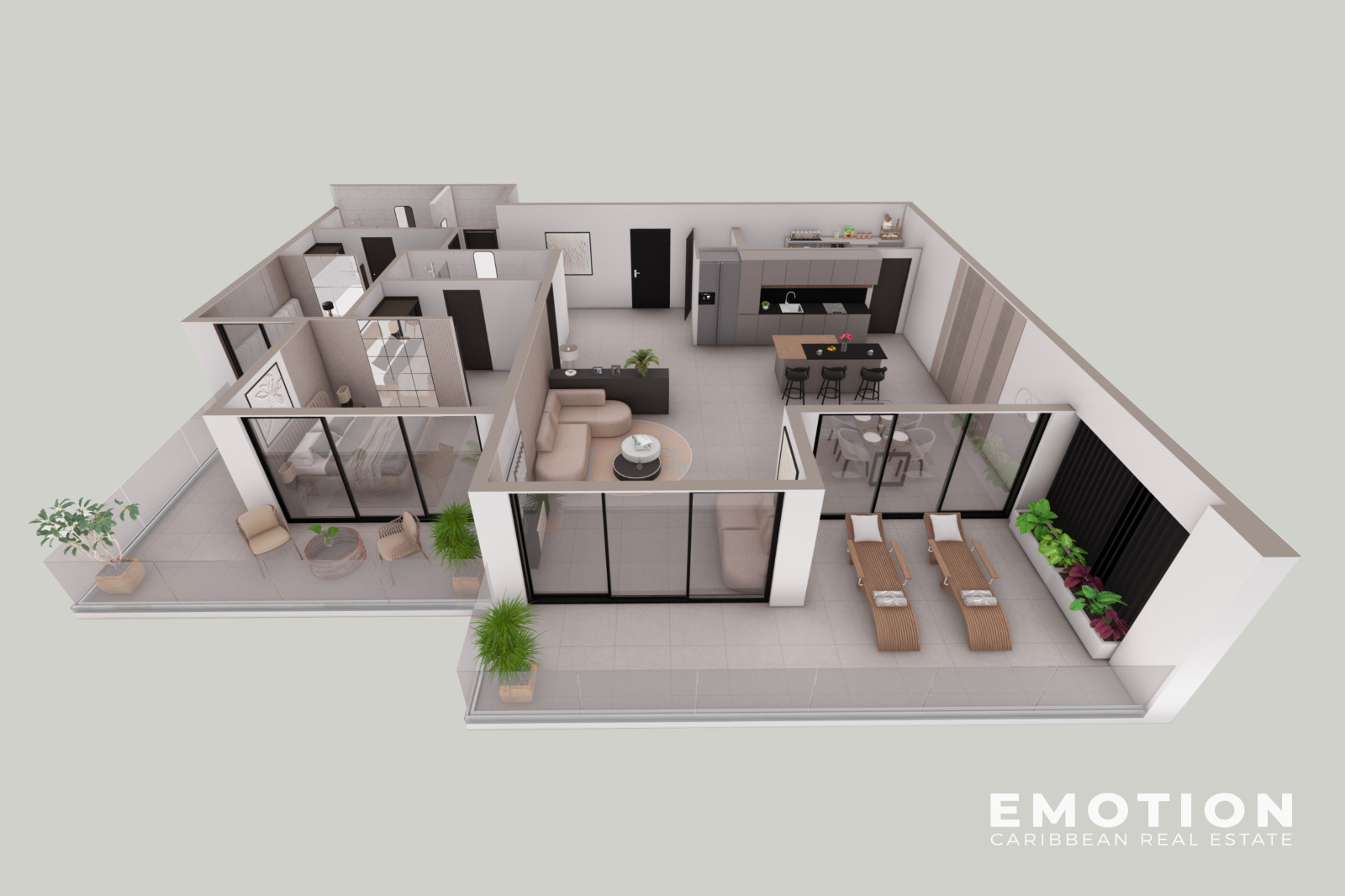 Le bien se compose : d’un vaste séjour lumineux prolongé par une terrasse privative, d’une cuisine moderne aménagée et équipée, de trois ou quatre chambres avec rangements intégrés, de plusieurs salles de bain aux finitions contemporaines. Les volumes généreux et la qualité des matériaux garantissent un cadre de vie élégant et fonctionnel. Tous les appartements sont vendus entièrement meublés et équipés, tels que présentés sur les images de synthèse.