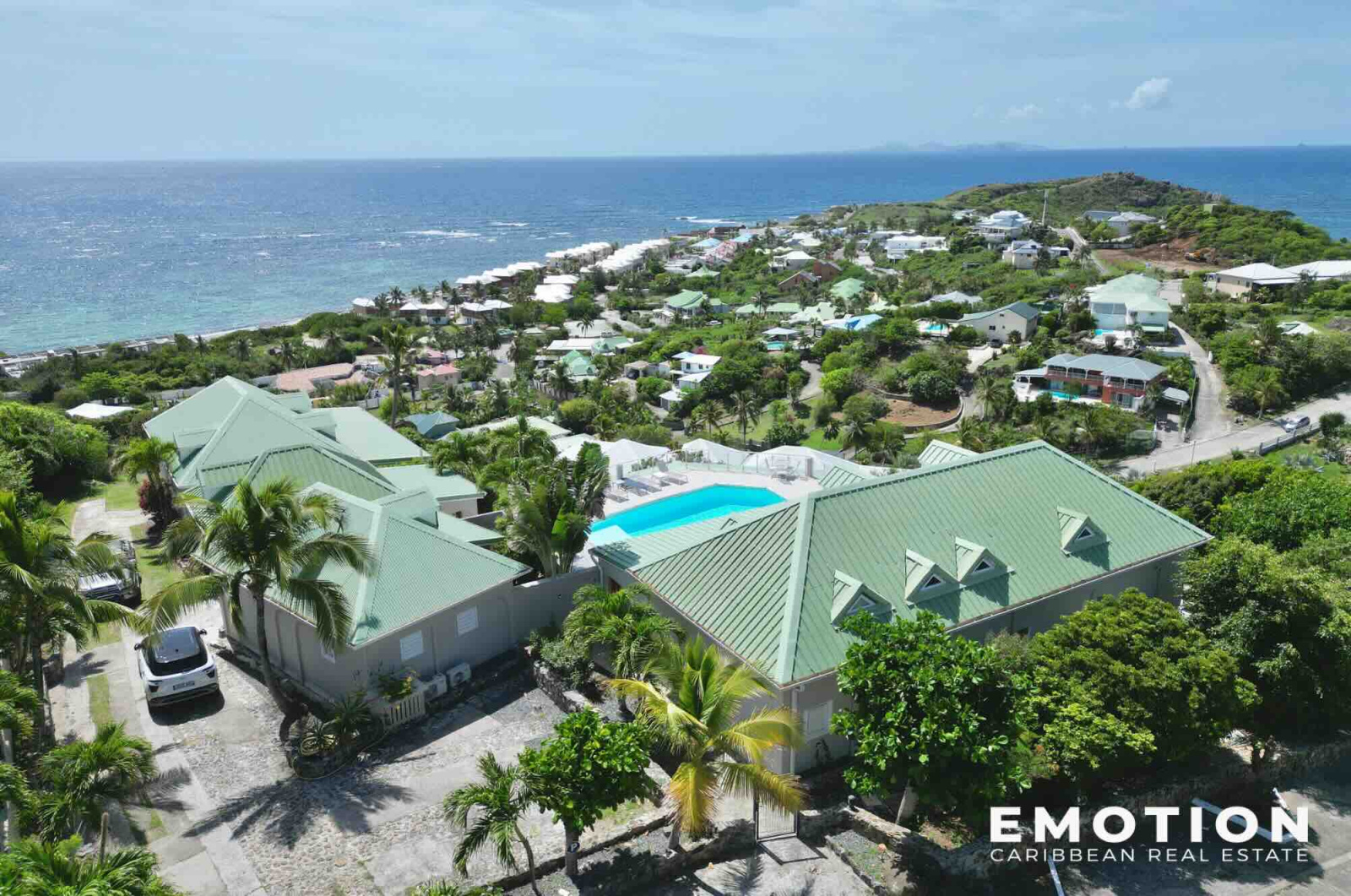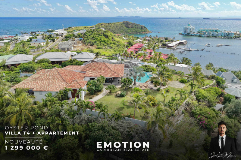 Le cabinet Emotion vous propose à la vente, à l’abri des risques de submersion marine, hors copropriété, un ensemble immobilier exceptionnel avec vue mer panoramique à 180°, sur le secteur très prisé d’Oyster Pond, à seulement quelques minutes à pied de la marina, de la frontière hollandaise, d’une épicerie locale.