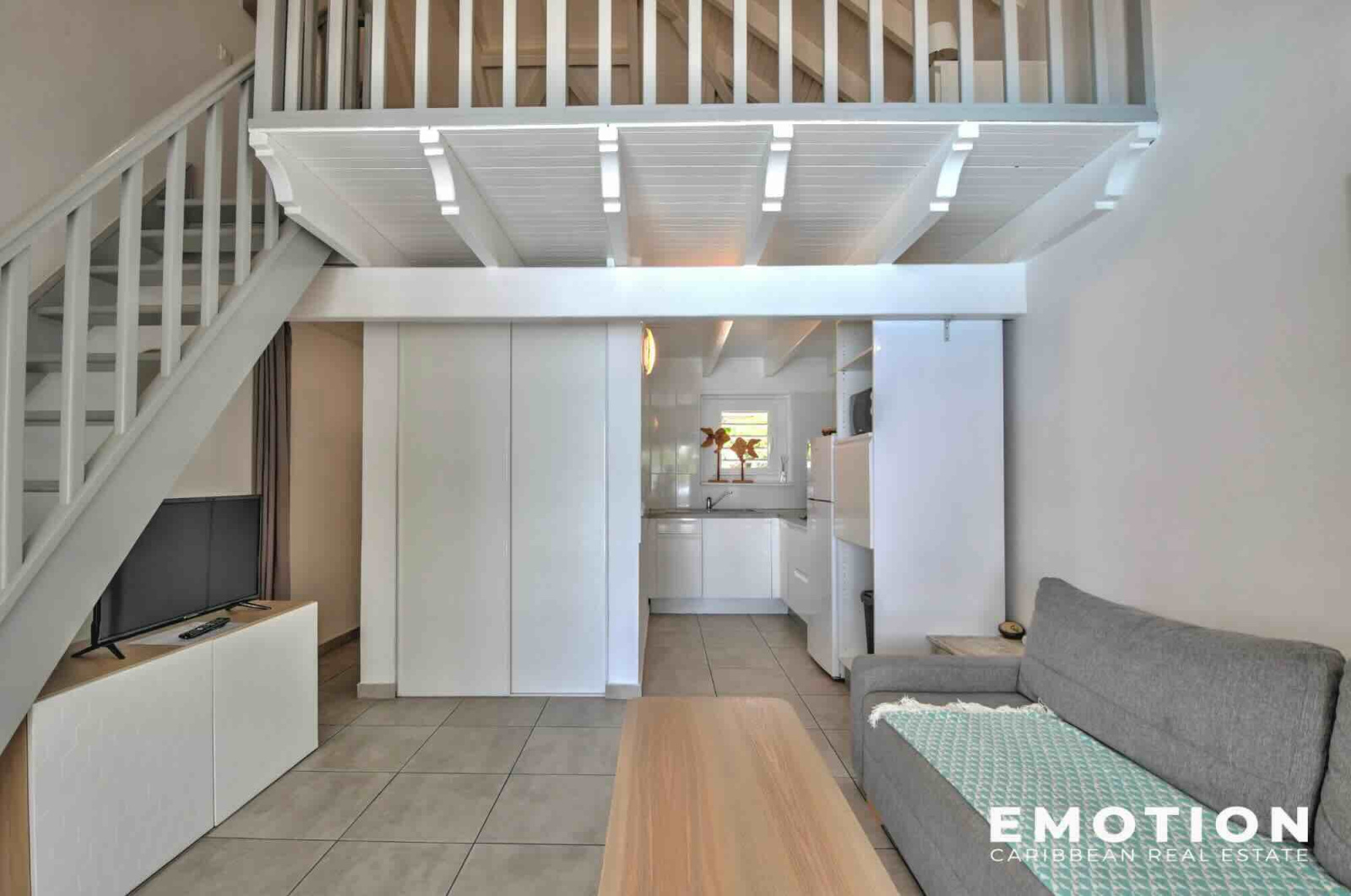 Appartement n°2 (duplex) : 38,5 m² comprenant un espace de vie au rez-de-chaussée avec cuisine équipée et vue mer, une chambre en mezzanine à l’étage, une salle d’eau et une terrasse de 11,5 m².