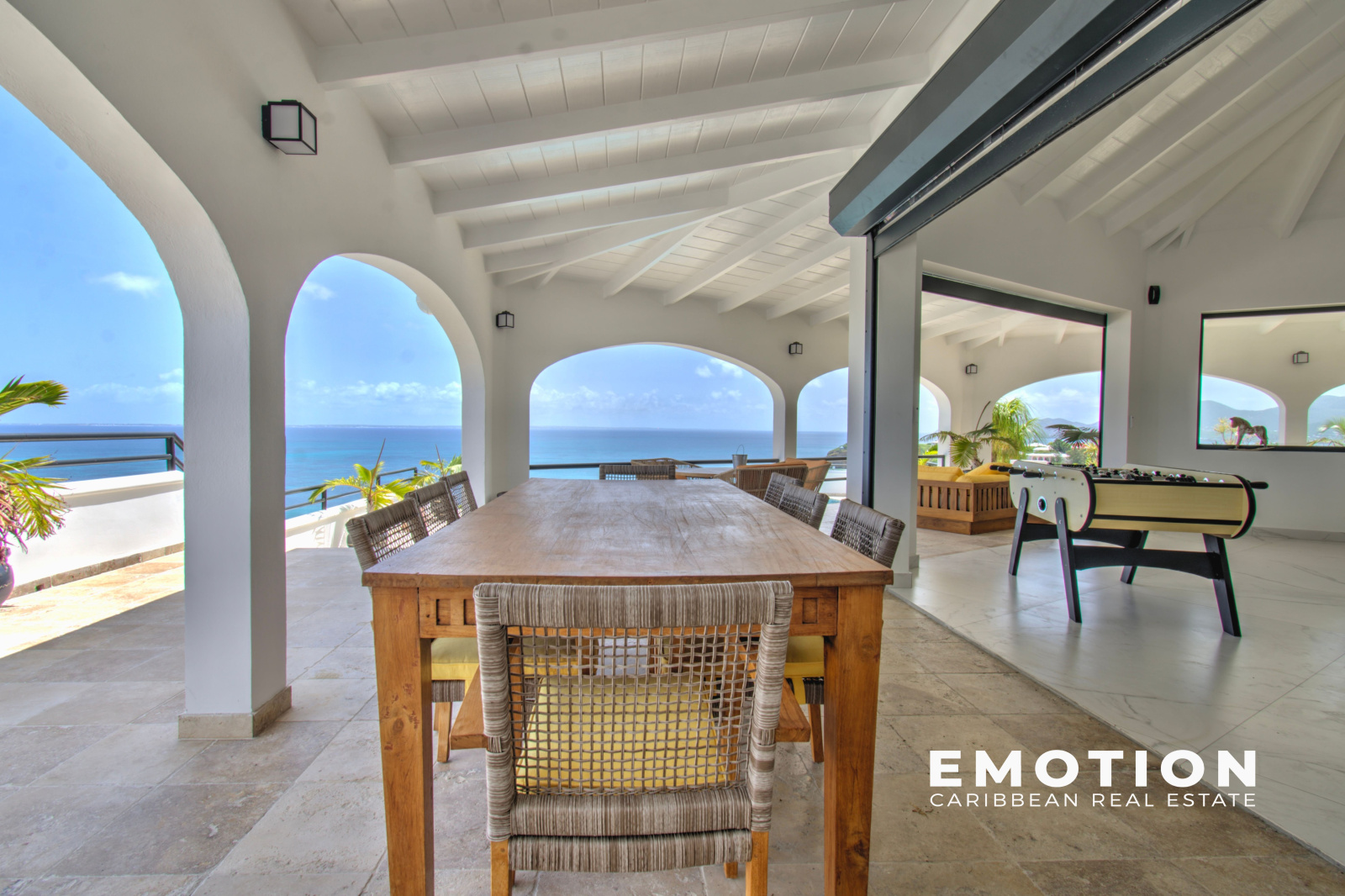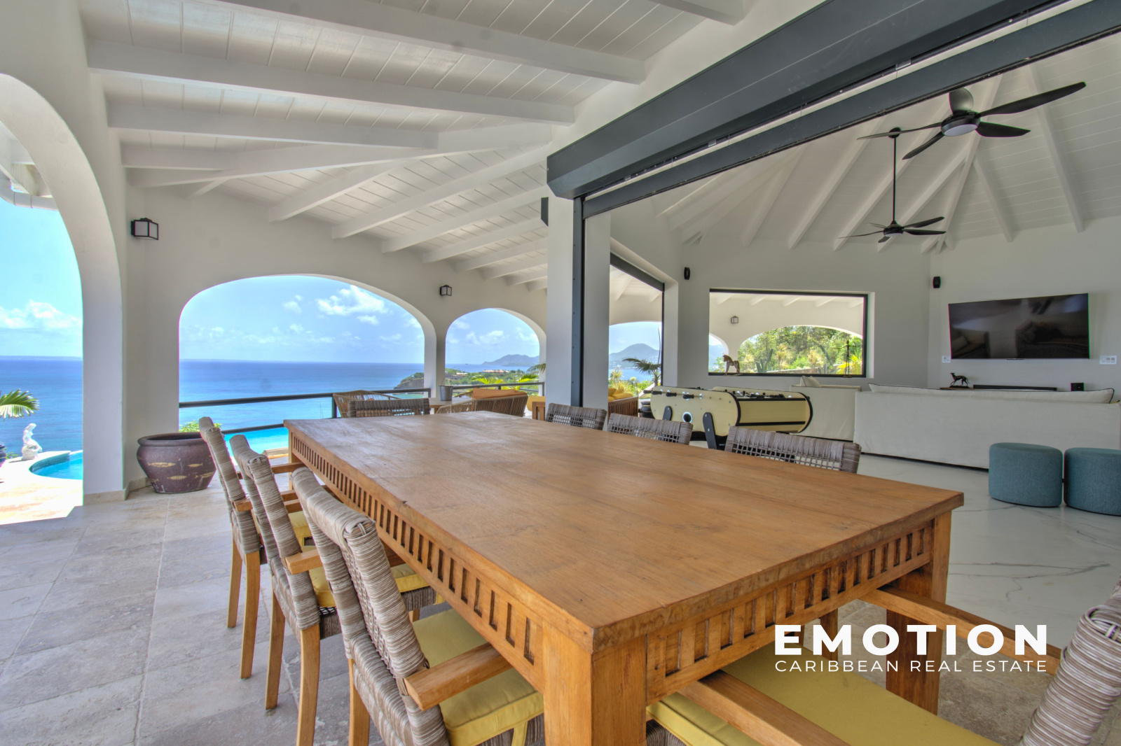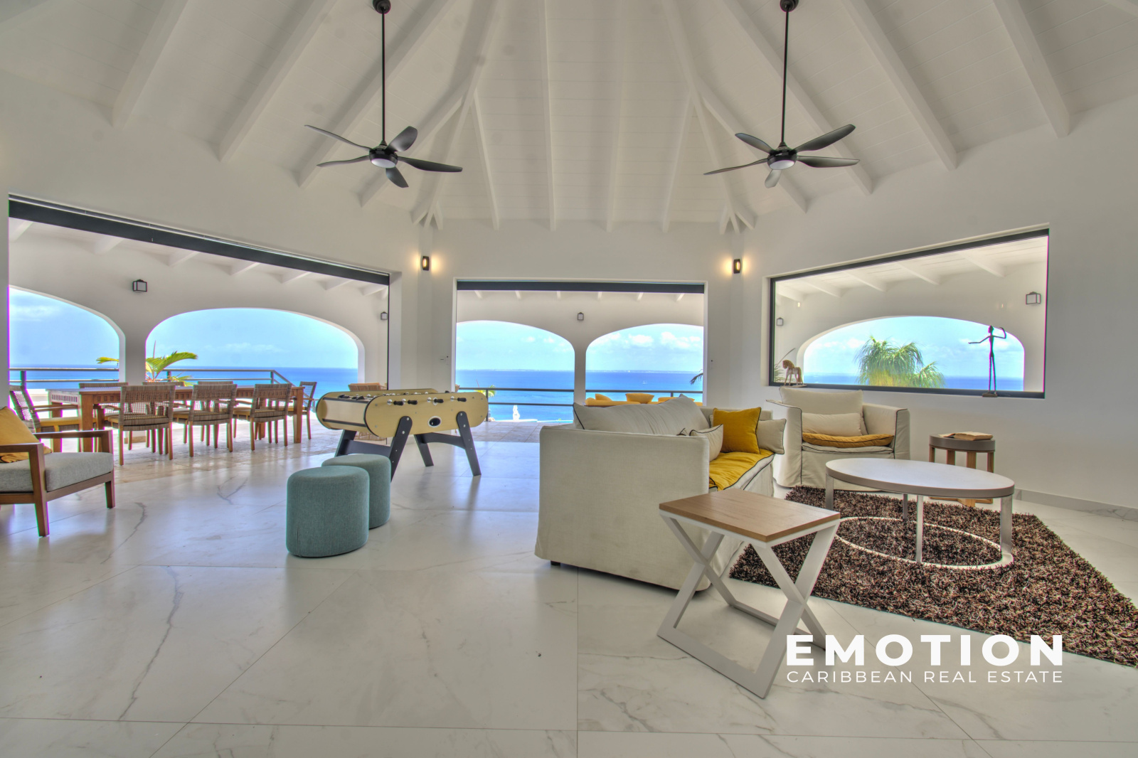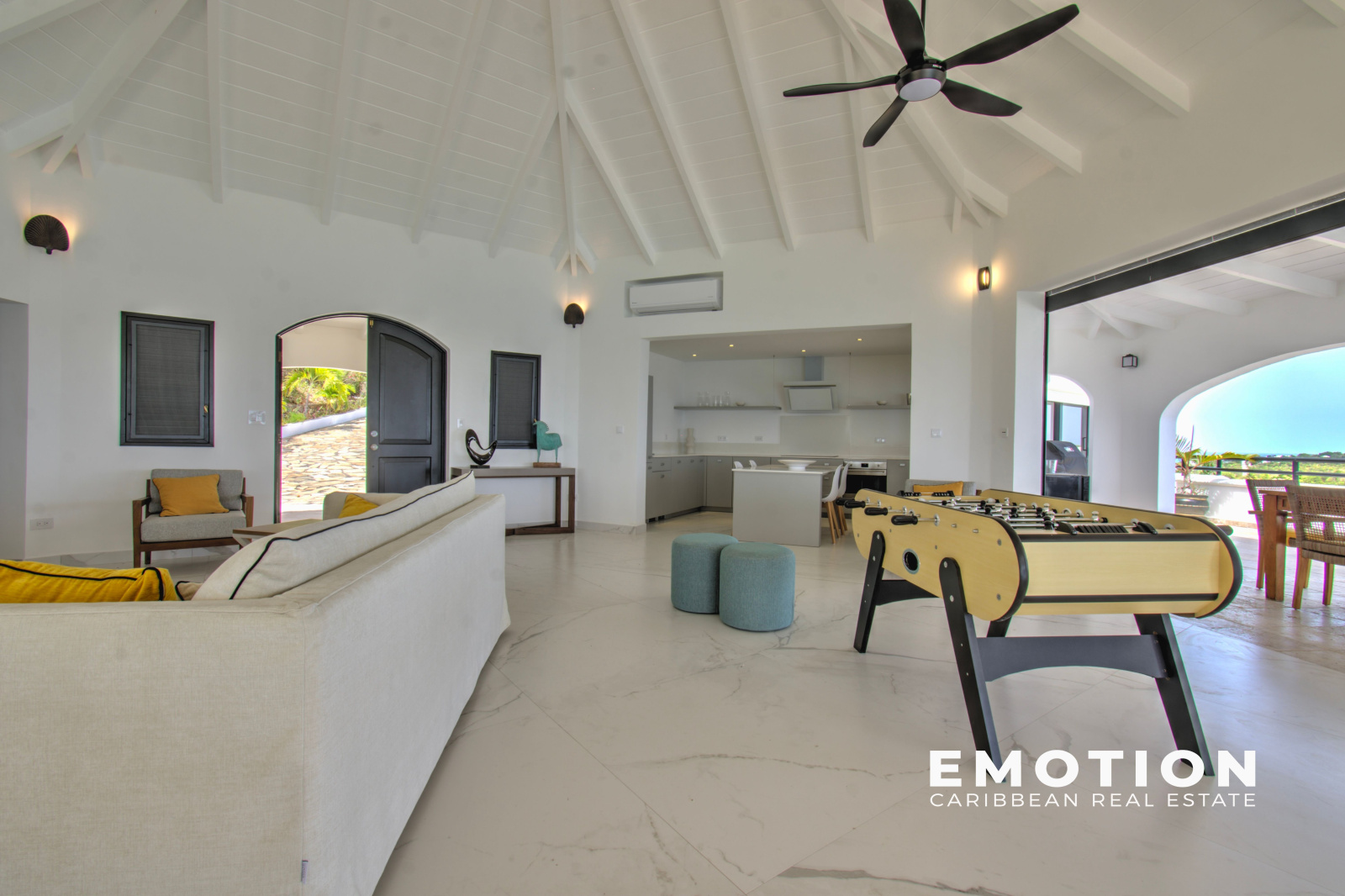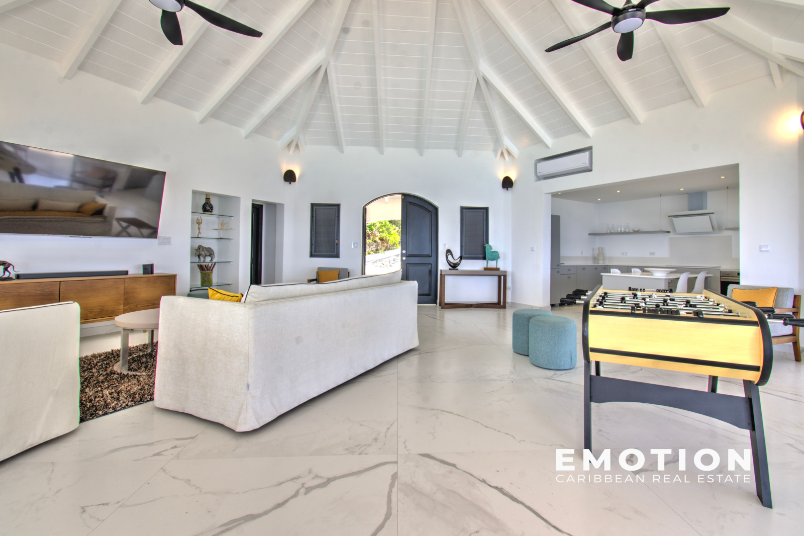 La villa se compose de plein pied d’une entrée spacieuse, d'un dégagement sur une pièce de vie avec cuisine ouverte aménagée et équipée, une salle à manger, un salon offrant une superficie d’environ 67 mètres carrés de pièce à vivre orientée sur les espaces extérieurs avec une partie de terrasse couverte et salon de réception, autour d'une piscine à débordement plongeante sur une magnifique vue mer, plage de Baie Rouge et Anguilla.