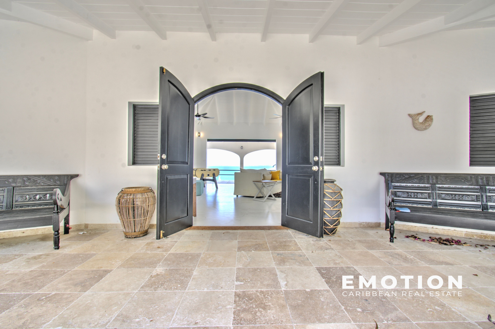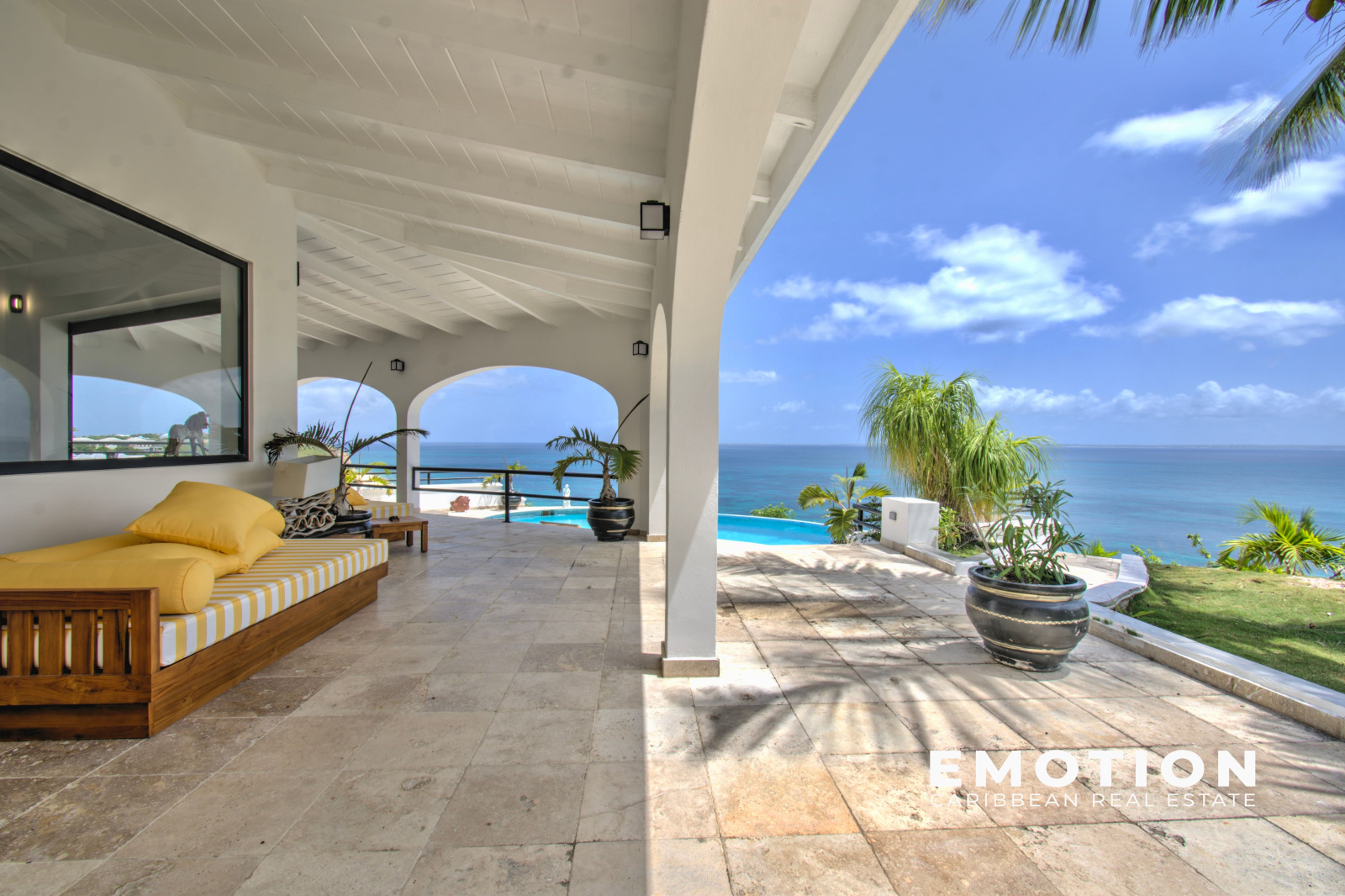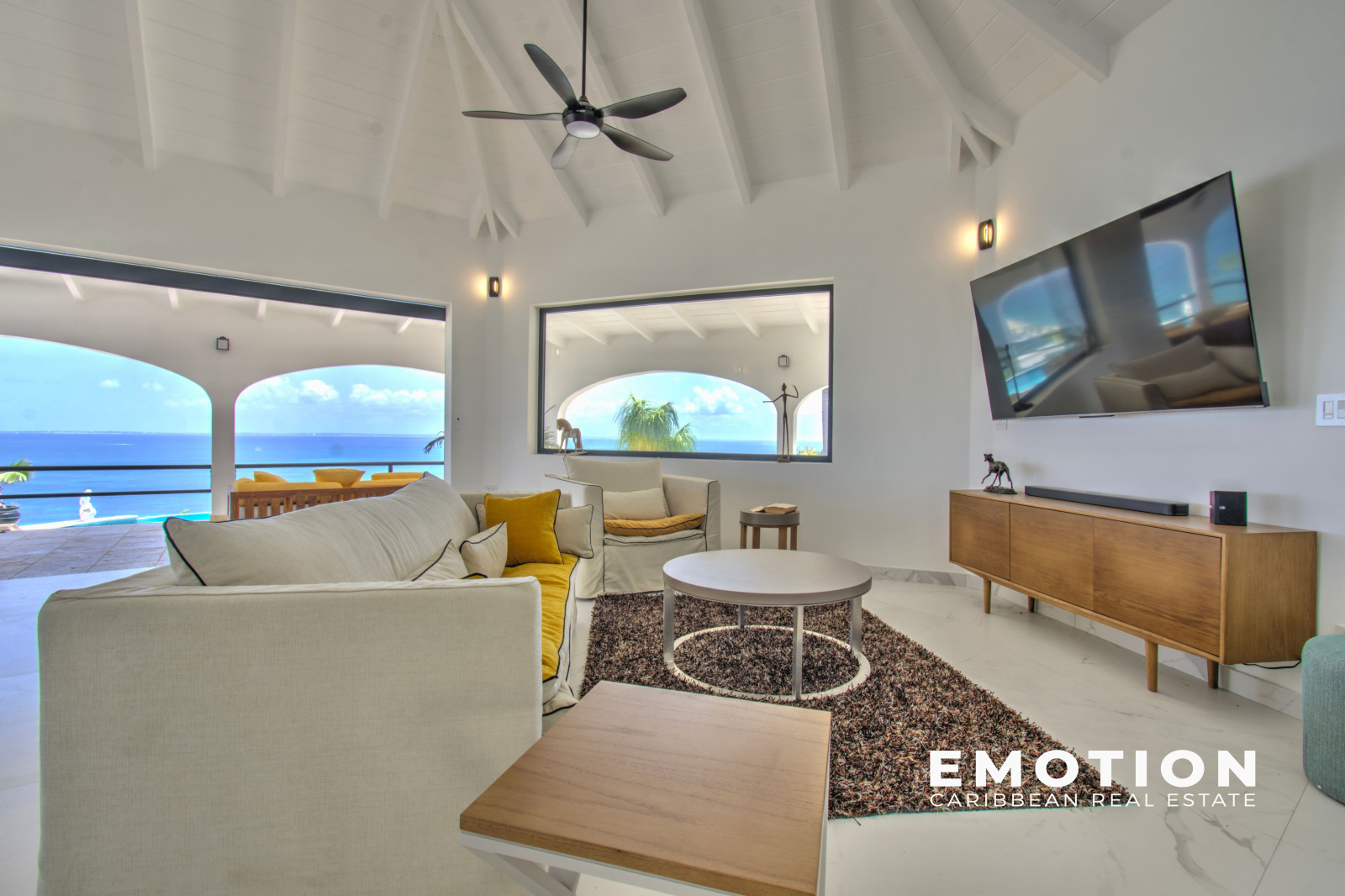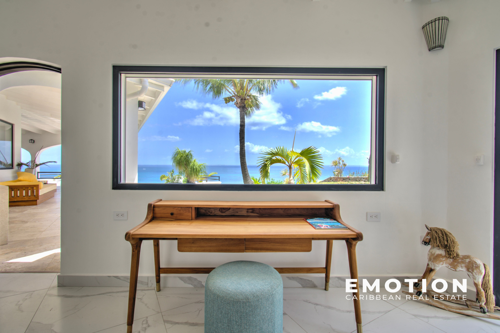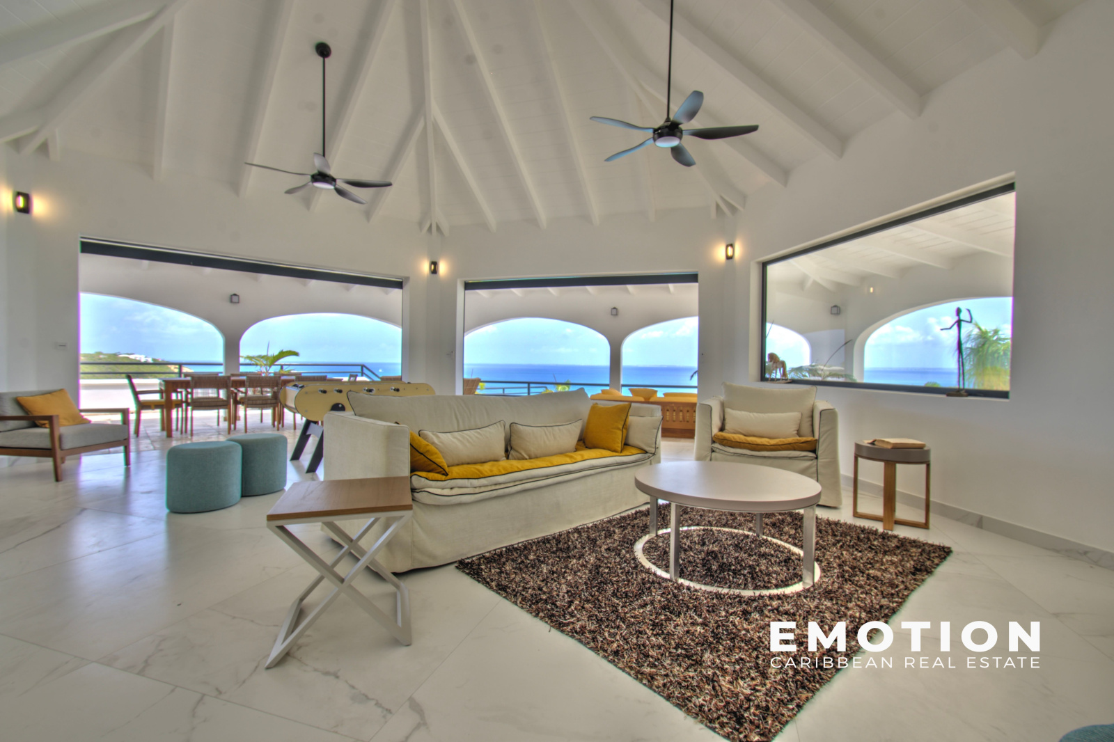 La villa se compose de plein pied d’une entrée spacieuse, d'un dégagement sur une pièce de vie avec cuisine ouverte aménagée et équipée, une salle à manger, un salon offrant une superficie d’environ 67 mètres carrés de pièce à vivre orientée sur les espaces extérieurs avec une partie de terrasse couverte et salon de réception, autour d'une piscine à débordement plongeante sur une magnifique vue mer, plage de Baie Rouge et Anguilla.