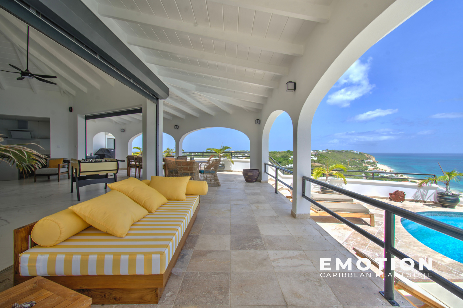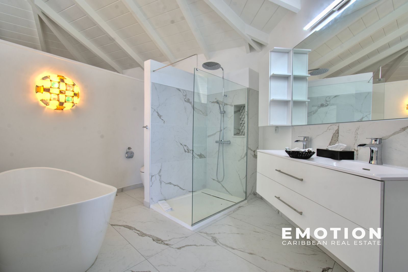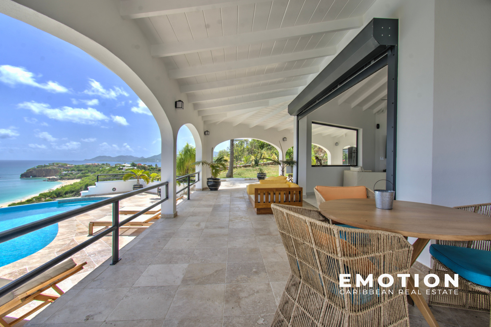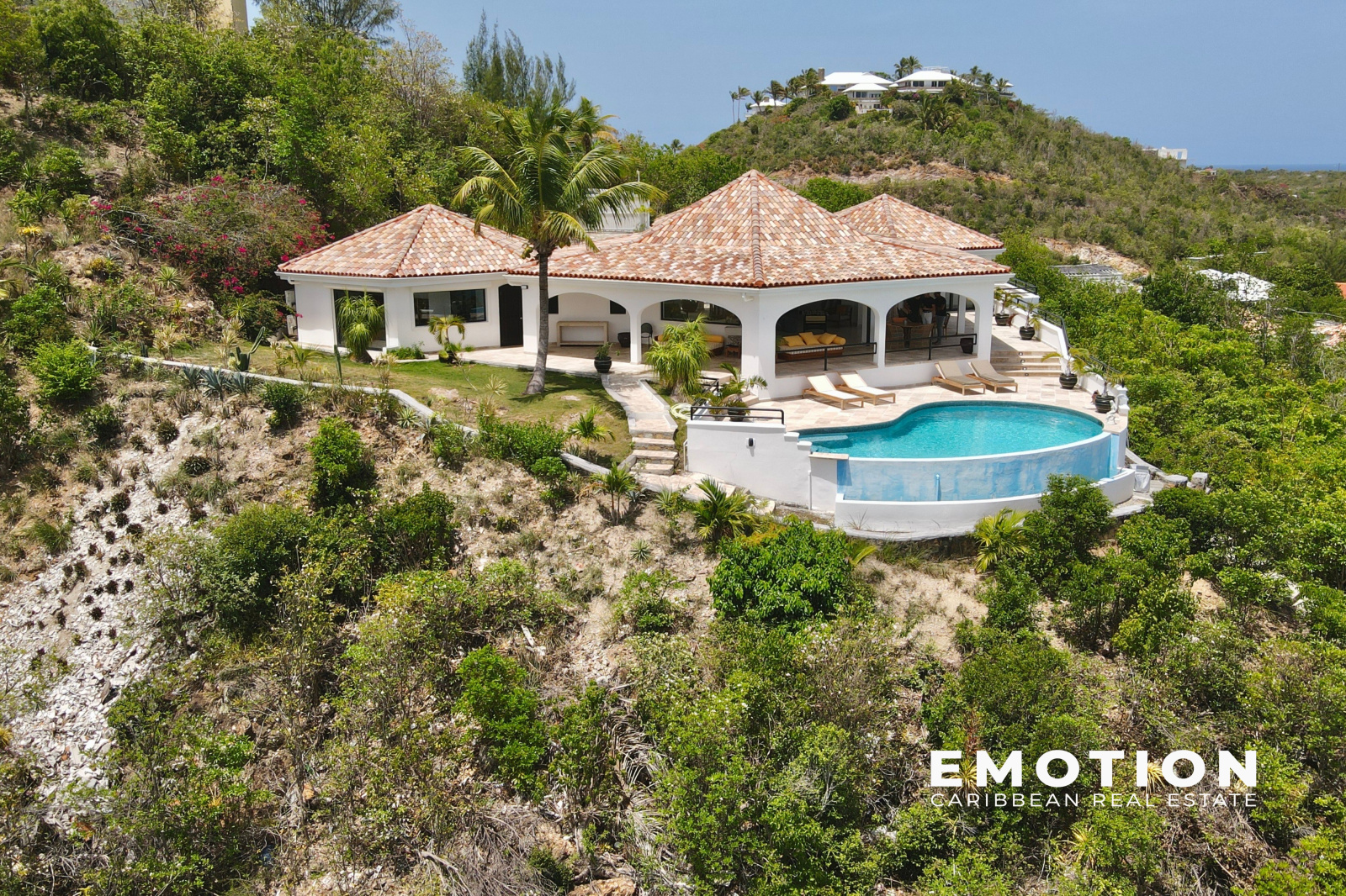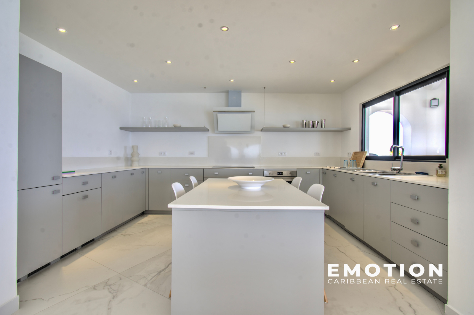 La villa se compose de plein pied d’une entrée spacieuse, d'un dégagement sur une pièce de vie avec cuisine ouverte aménagée et équipée, une salle à manger, un salon offrant une superficie d’environ 67 mètres carrés de pièce à vivre orientée sur les espaces extérieurs avec une partie de terrasse couverte et salon de réception, autour d'une piscine à débordement plongeante sur une magnifique vue mer, plage de Baie Rouge et Anguilla.