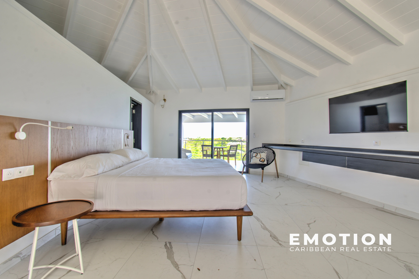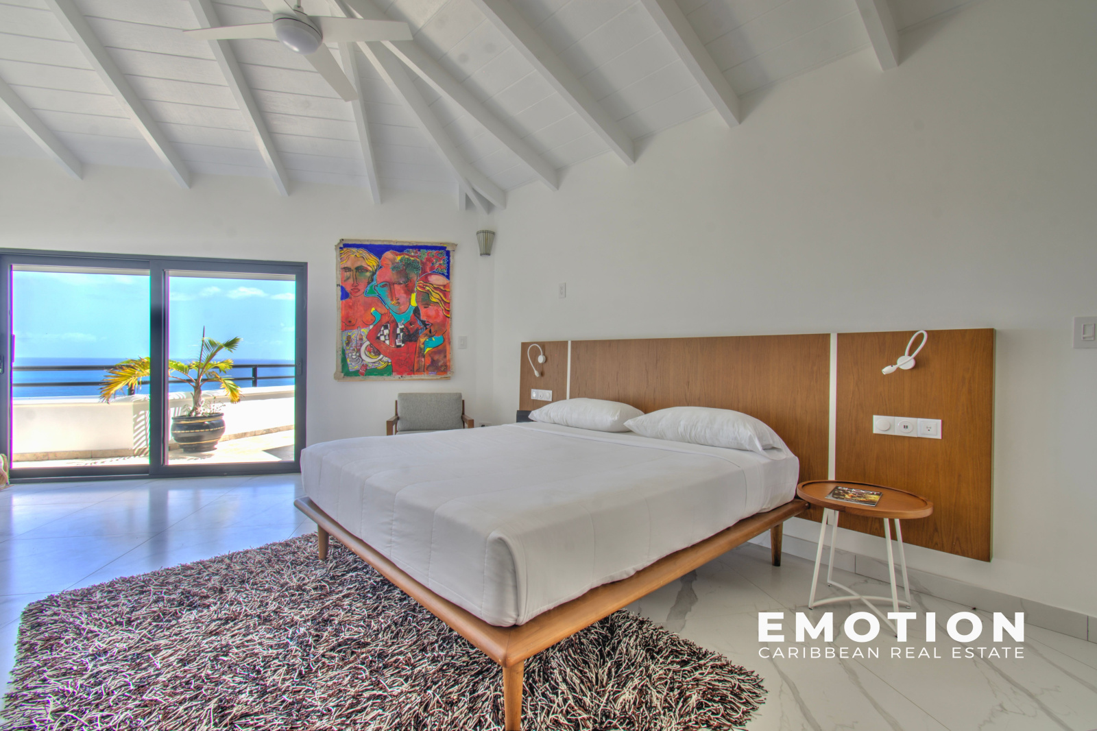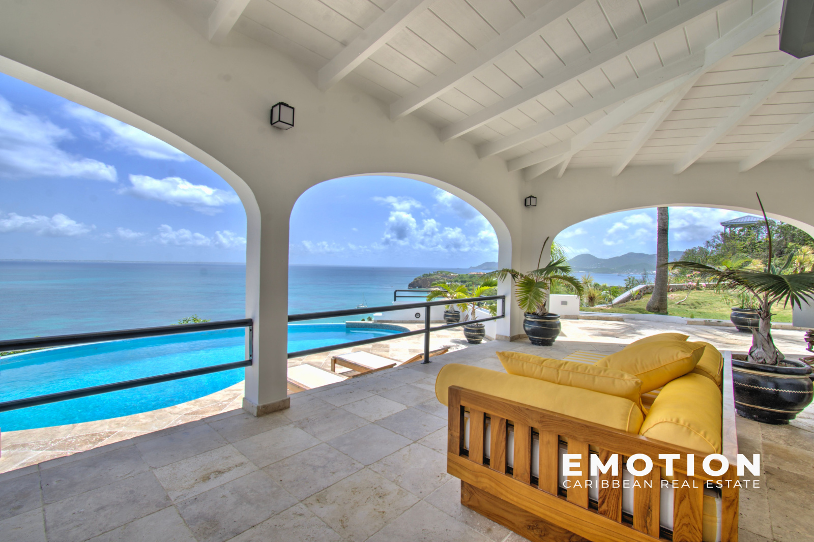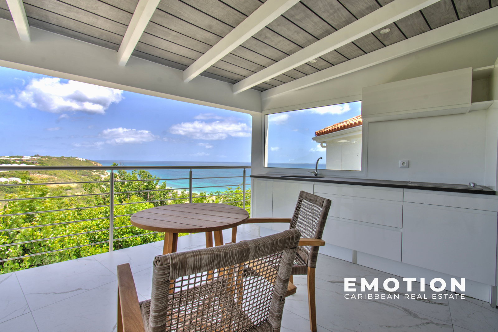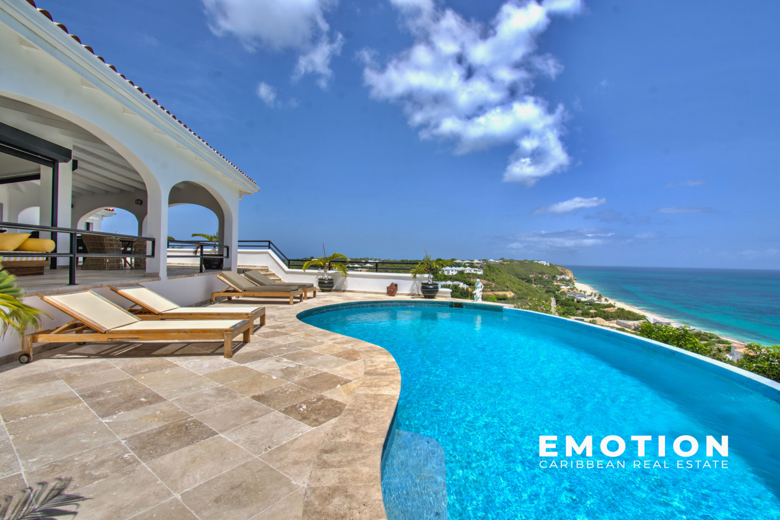 La villa se compose de plein pied d’une entrée spacieuse, d'un dégagement sur une pièce de vie avec cuisine ouverte aménagée et équipée, une salle à manger, un salon offrant une superficie d’environ 67 mètres carrés de pièce à vivre orientée sur les espaces extérieurs avec une partie de terrasse couverte et salon de réception, autour d'une piscine à débordement plongeante sur une magnifique vue mer, plage de Baie Rouge et Anguilla.