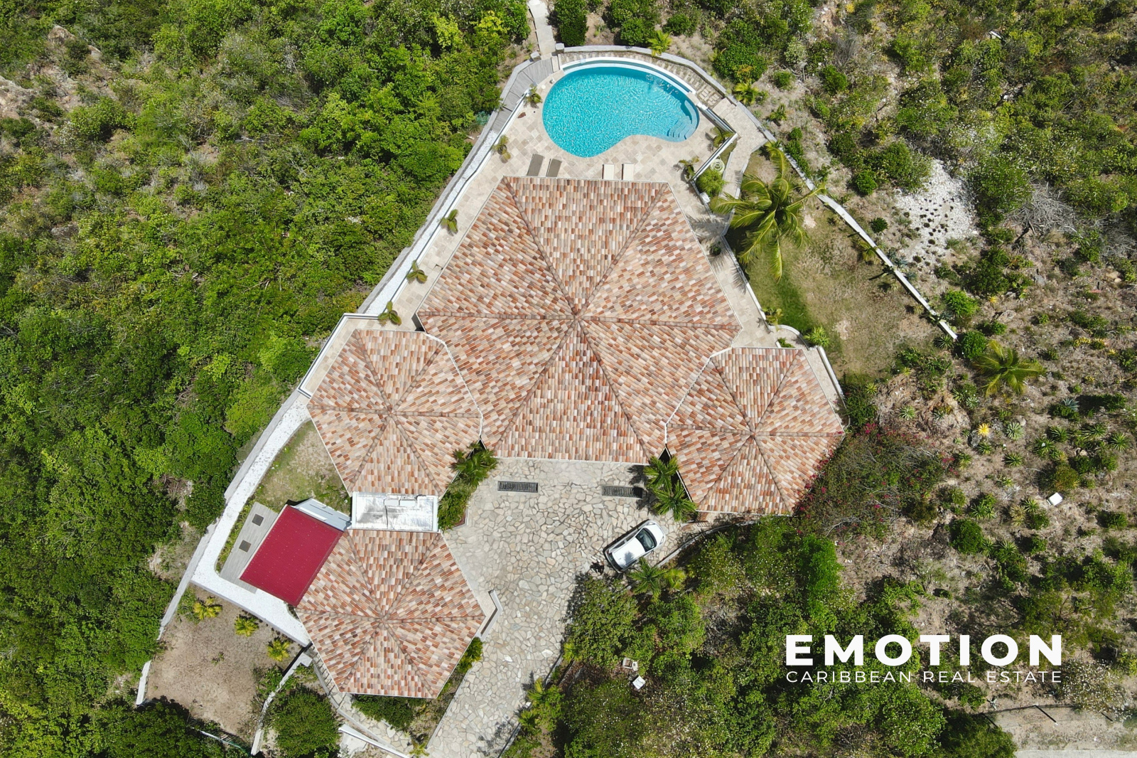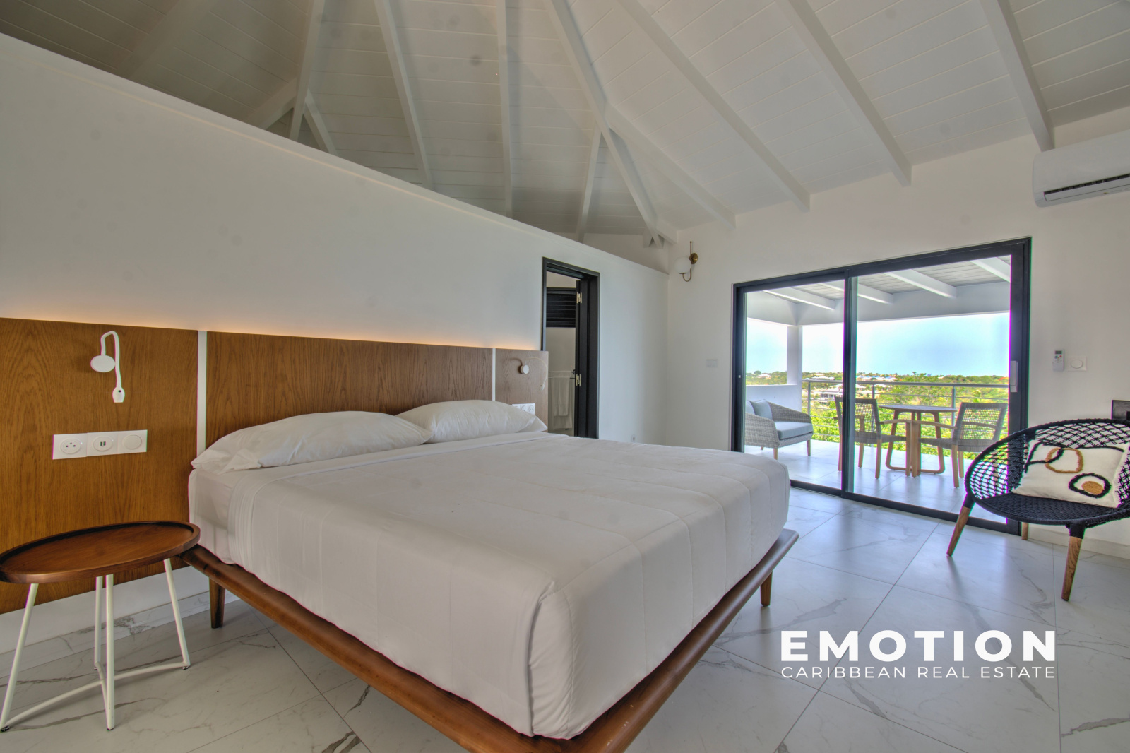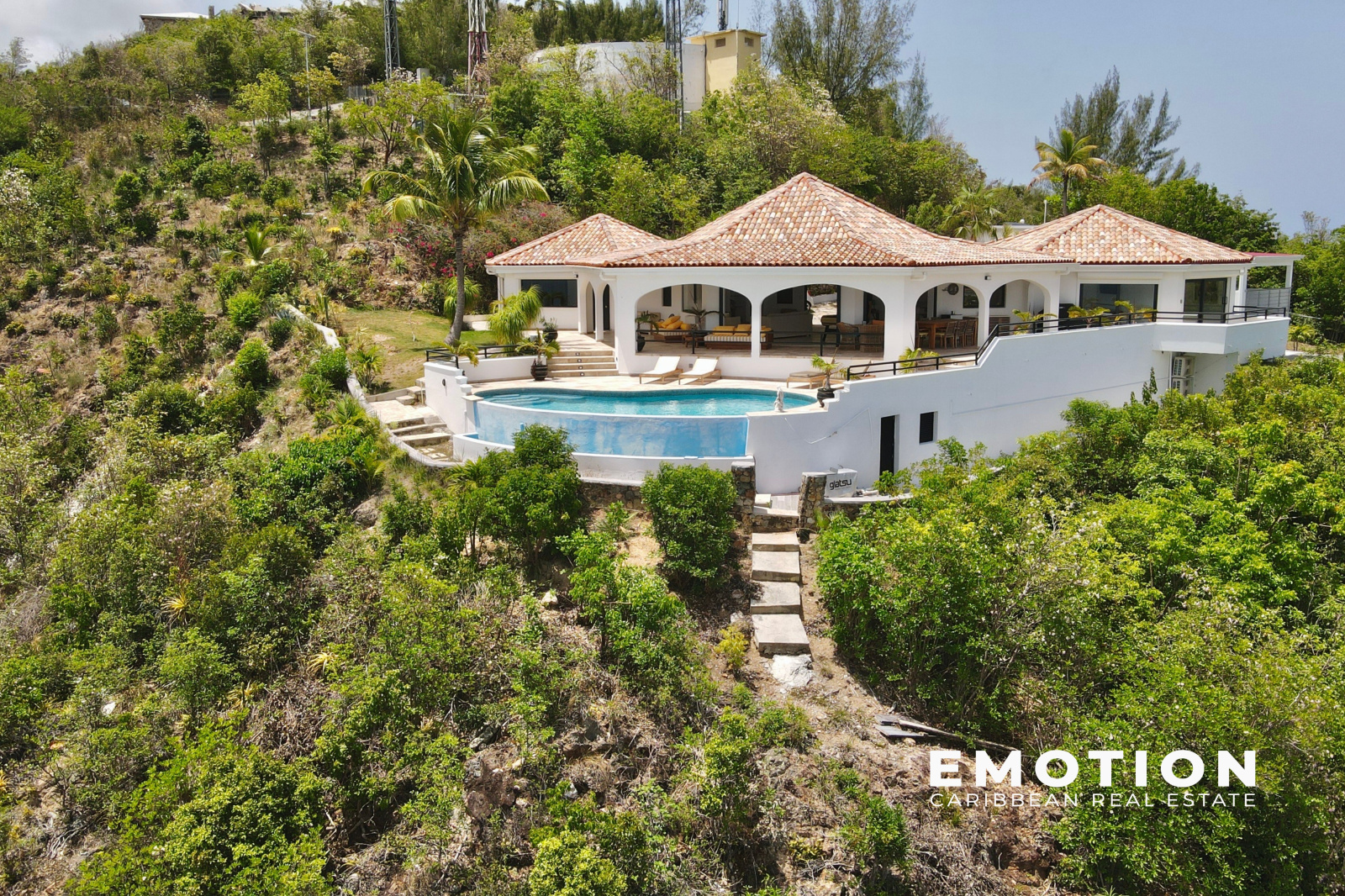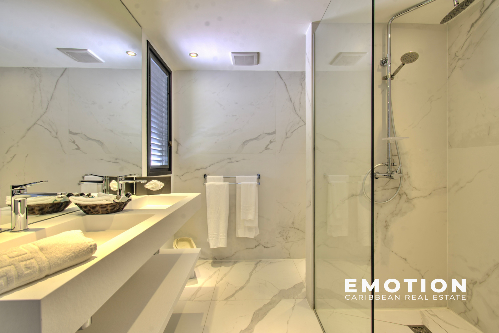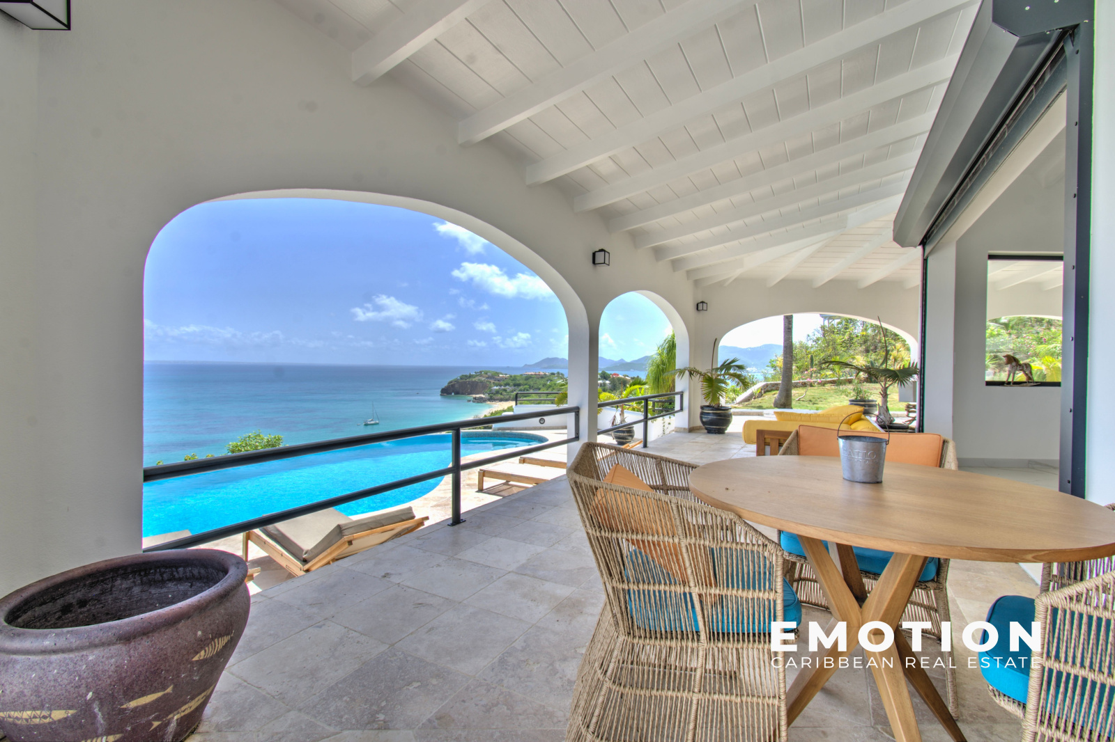 La villa se compose de plein pied d’une entrée spacieuse, d'un dégagement sur une pièce de vie avec cuisine ouverte aménagée et équipée, une salle à manger, un salon offrant une superficie d’environ 67 mètres carrés de pièce à vivre orientée sur les espaces extérieurs avec une partie de terrasse couverte et salon de réception, autour d'une piscine à débordement plongeante sur une magnifique vue mer, plage de Baie Rouge et Anguilla.