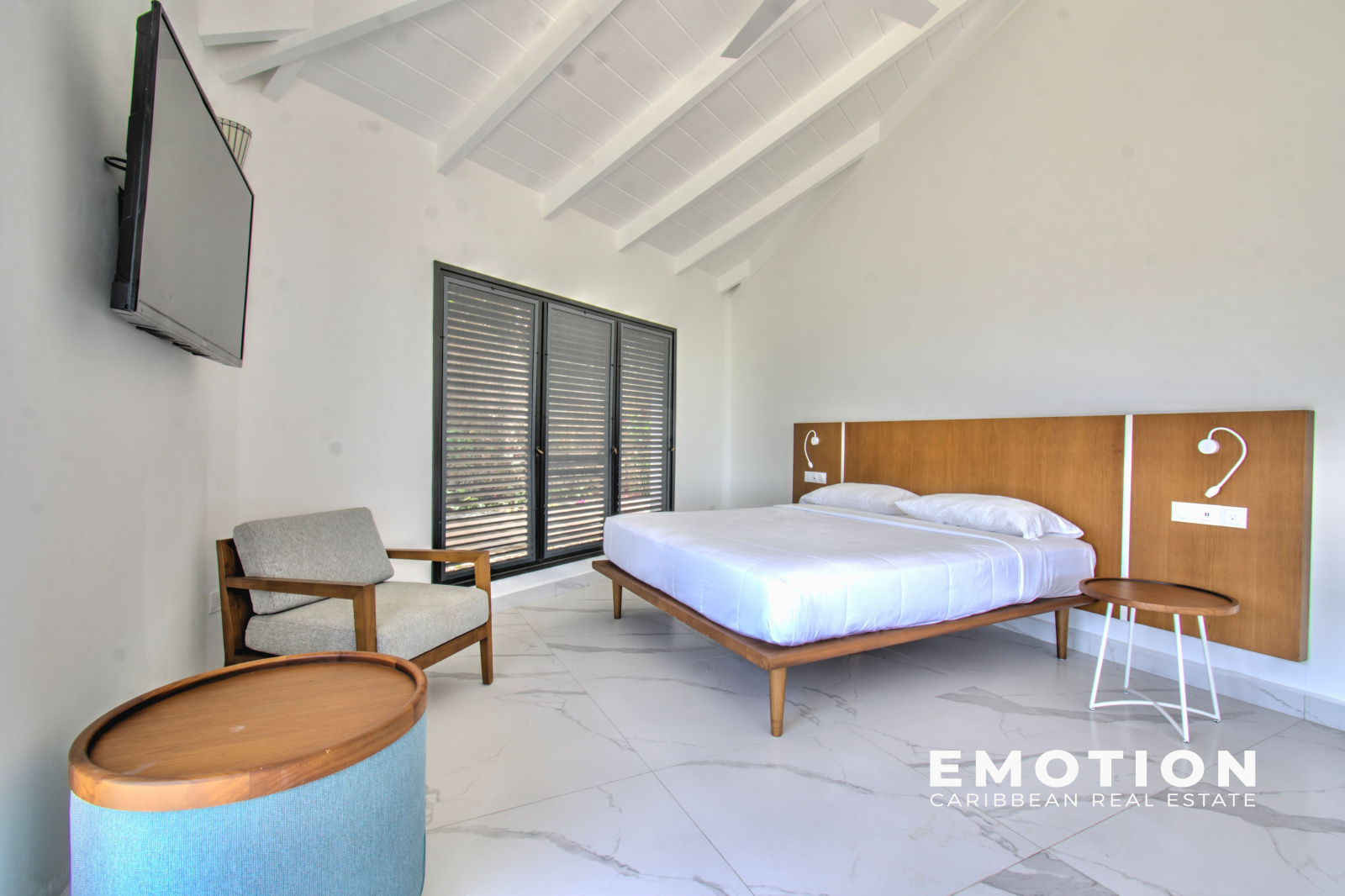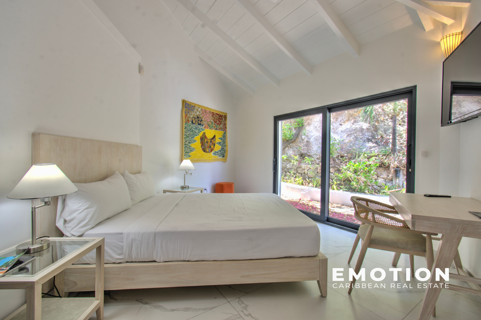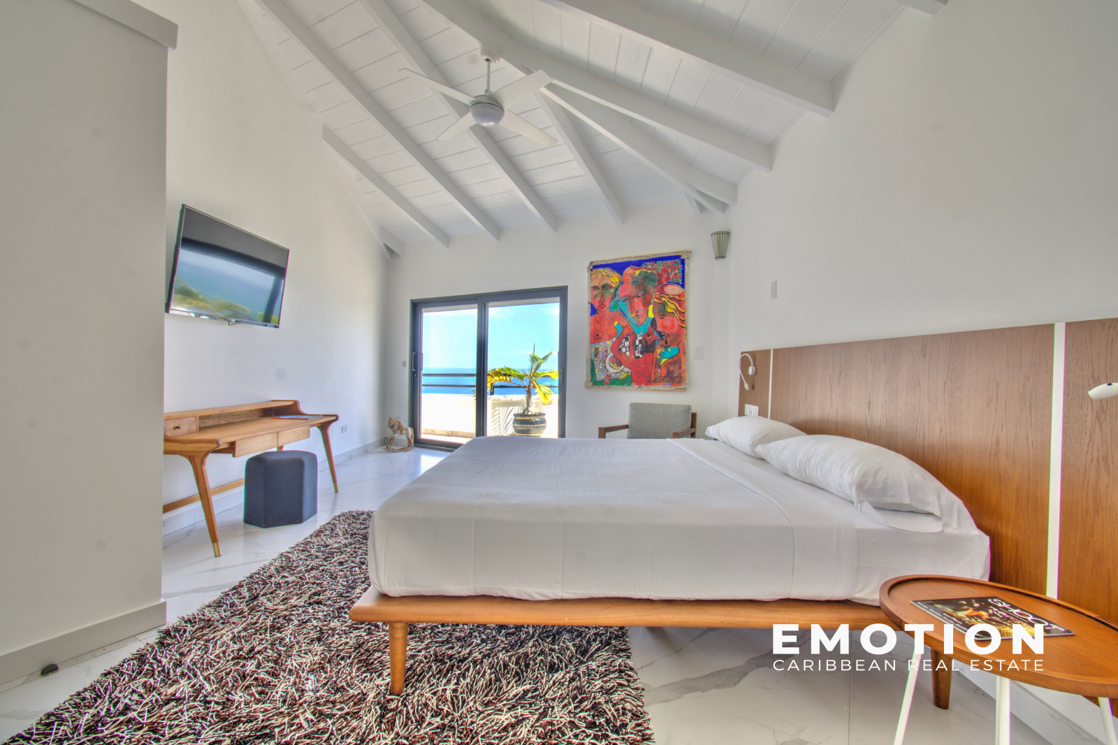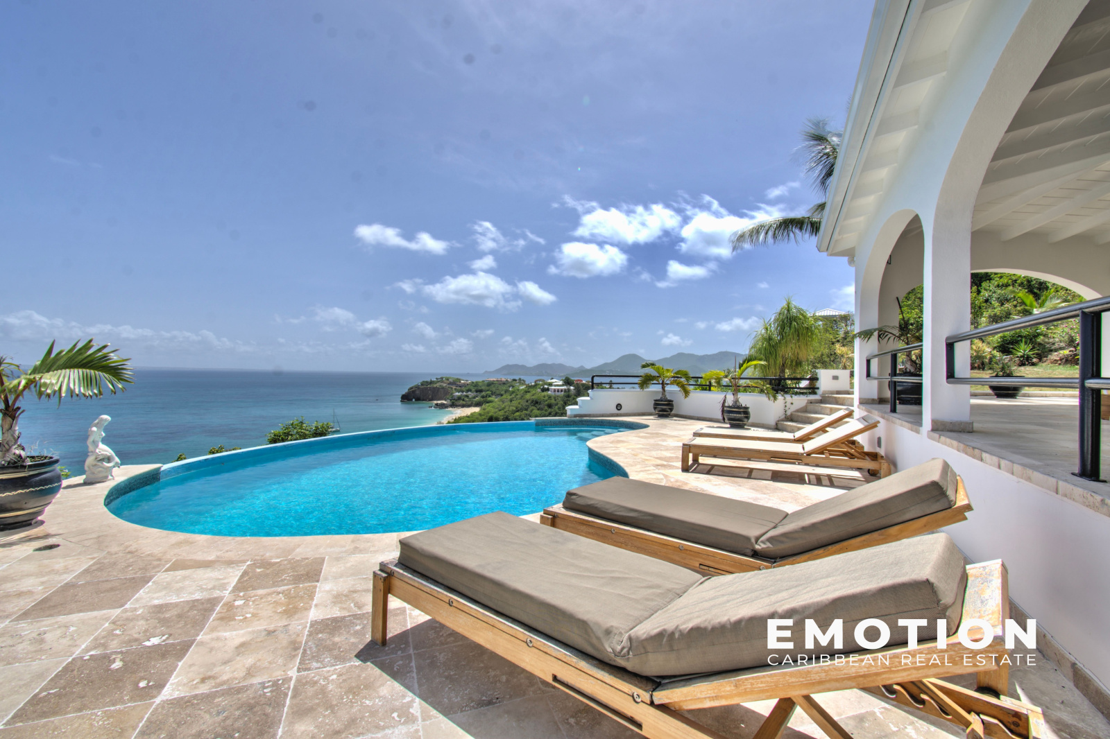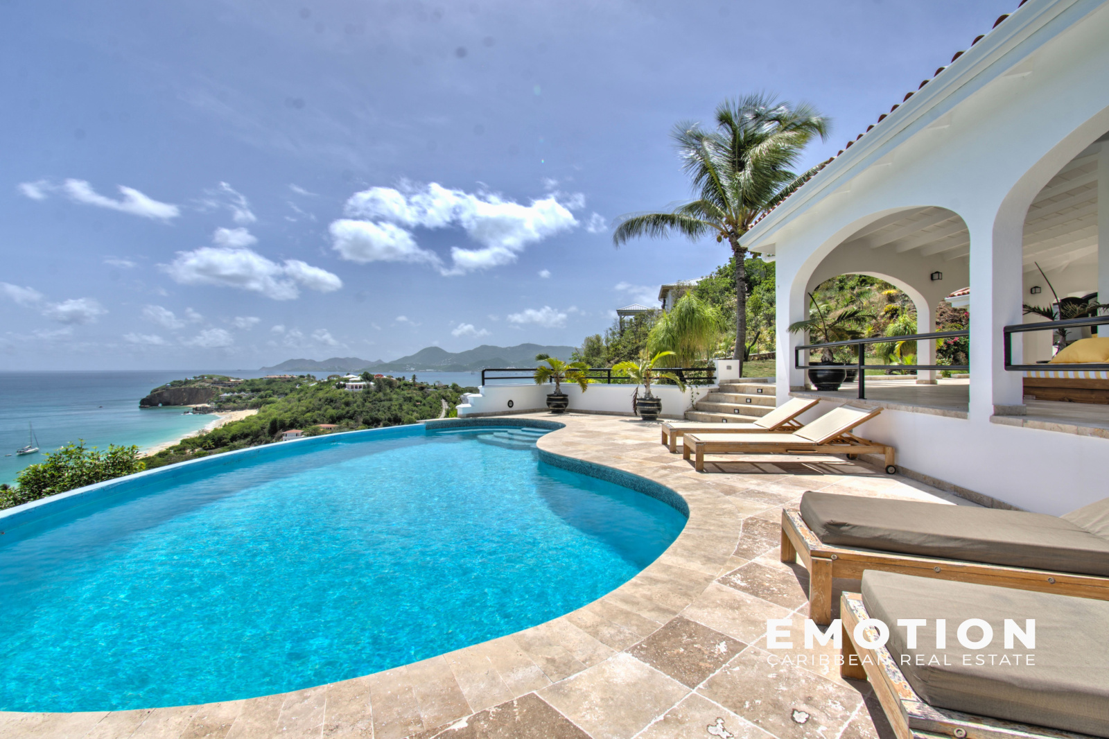La villa se compose de plein pied d’une entrée spacieuse, d'un dégagement sur une pièce de vie avec cuisine ouverte aménagée et équipée, une salle à manger, un salon offrant une superficie d’environ 67 mètres carrés de pièce à vivre orientée sur les espaces extérieurs avec une partie de terrasse couverte et salon de réception, autour d'une piscine à débordement plongeante sur une magnifique vue mer, plage de Baie Rouge et Anguilla.