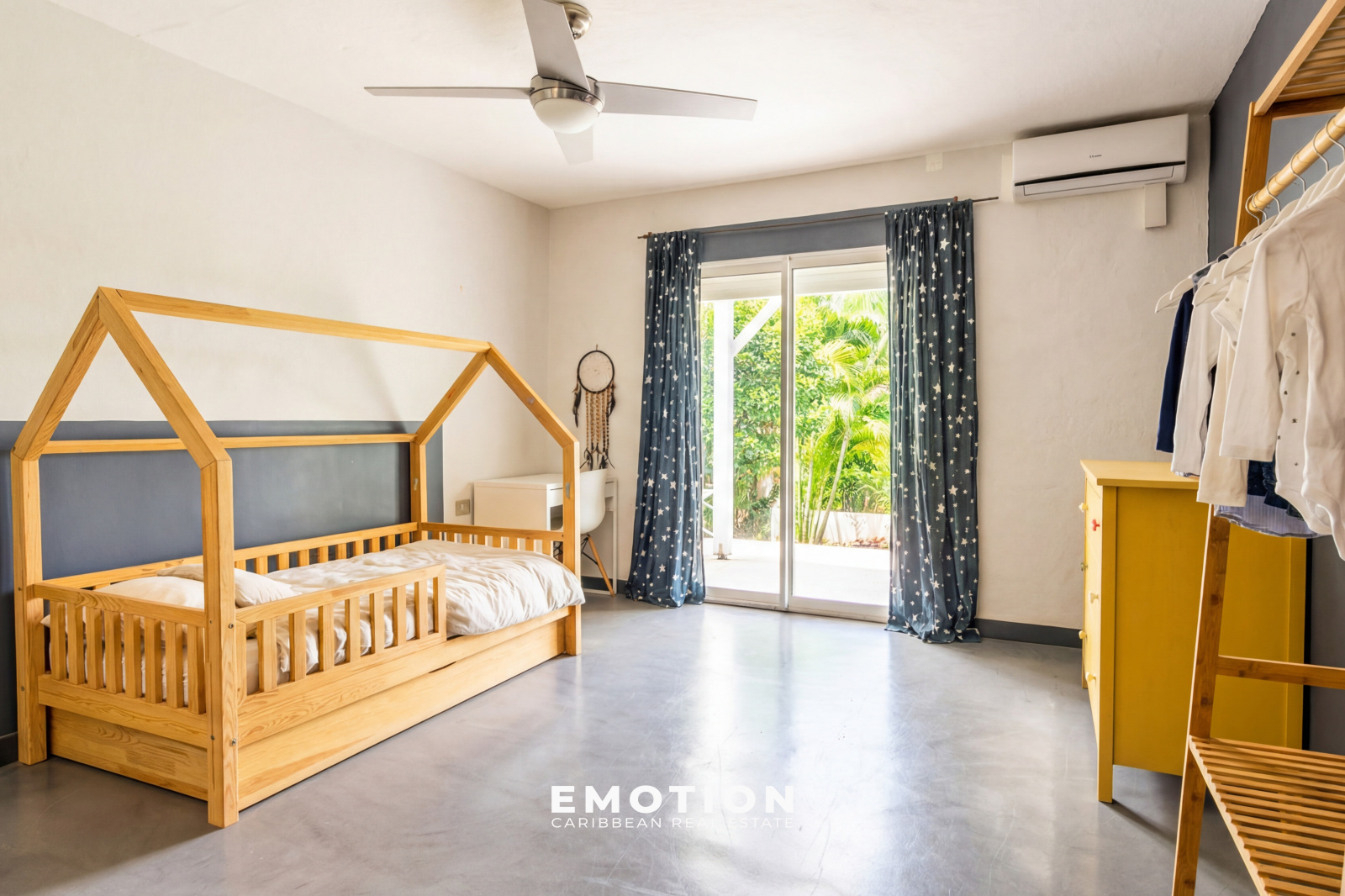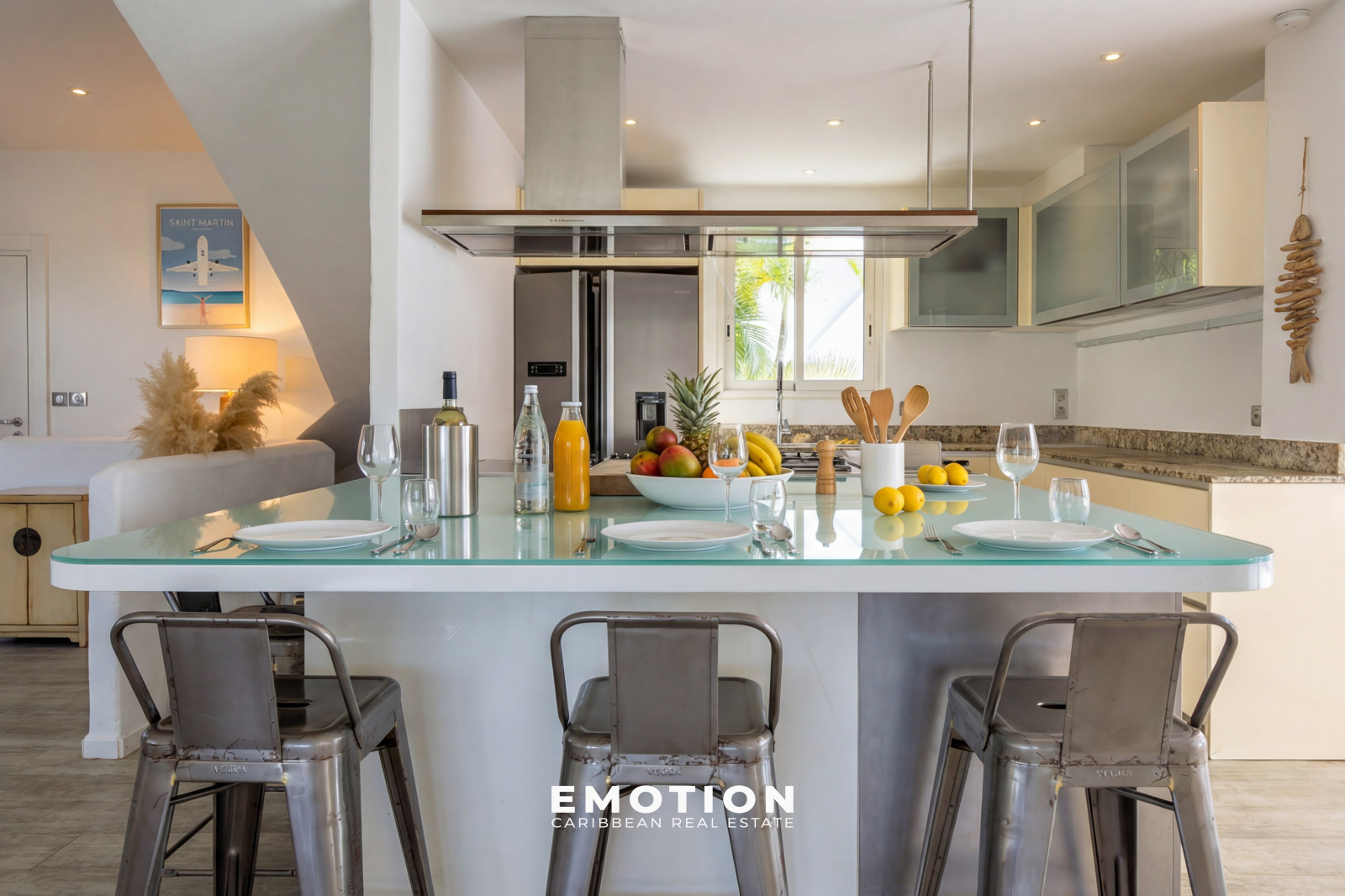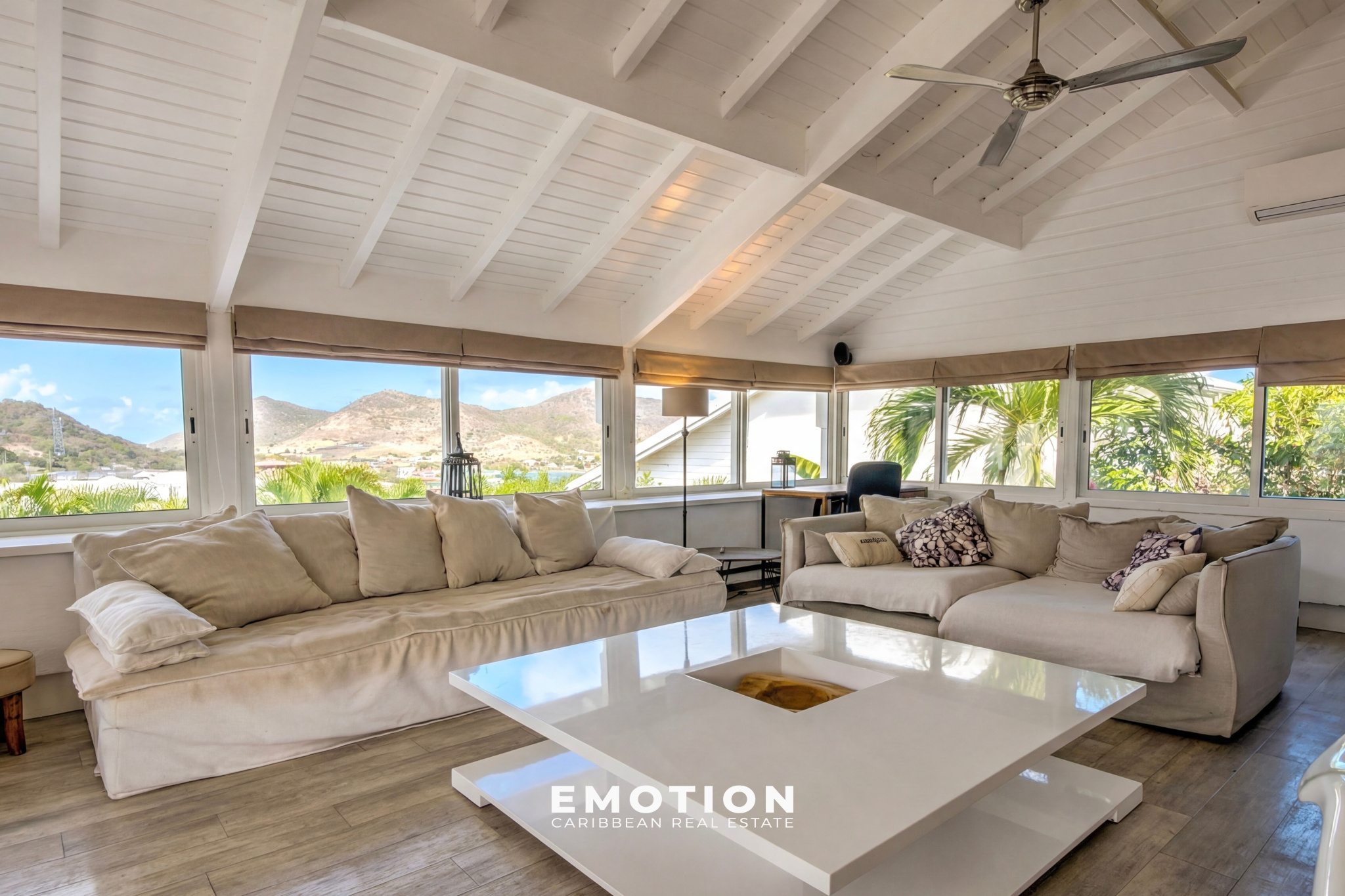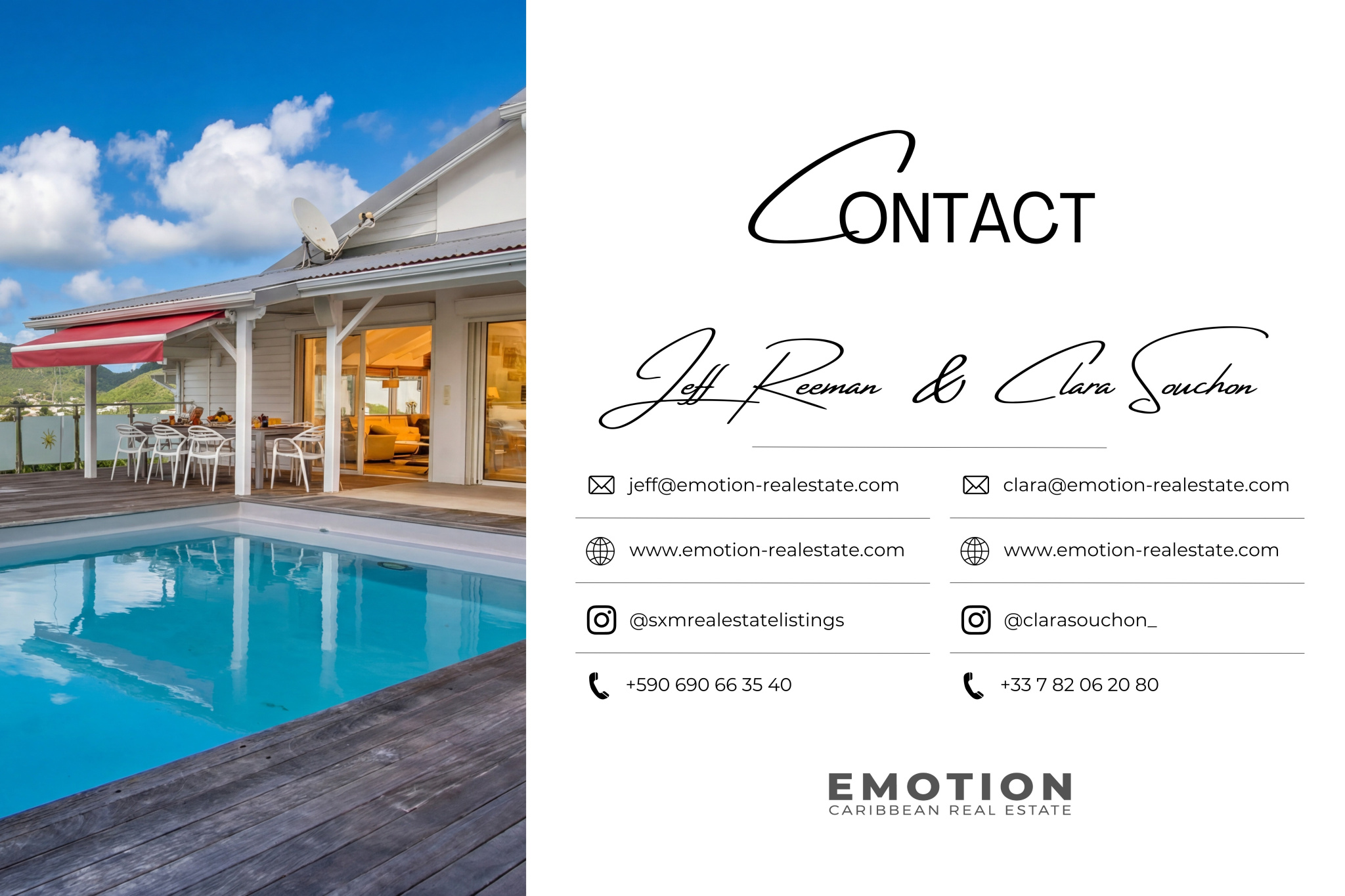 Le bien se compose en annexes : d’une piscine béton de 8x4 m, d’une cuisine extérieure, d’un salon marocain, 3 terrasses couvertes de 14,05 m² et 9 m², un groupe électrogène, une citerne d’eau de 27 m³, de volets extérieurs, et d’un sol en PVC. Les margelles de la piscine sont en béton, les garde-corps en verre, et les décors en bois rouge. La toiture a été changée après le passage de l’ouragan Irma en 2017.