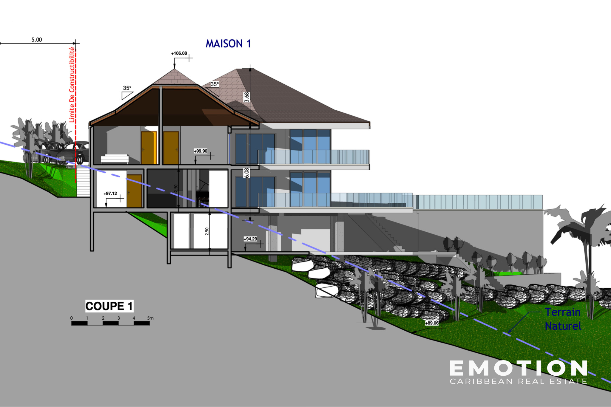 Ce projet se distingue également par une particularité exceptionnelle à Terres Basses : grâce à l’existence d’une structure déjà présente, le permis a autorisé la construction de la villa principale sur trois niveaux habitables. Un véritable atout, car la majorité des constructions du secteur sont limitées à un seul niveau. Il s’agit là de l’une des seules propriétés de Terres Basses à offrir trois plateaux exploitables avec vue, volume et potentiel architectural rare.